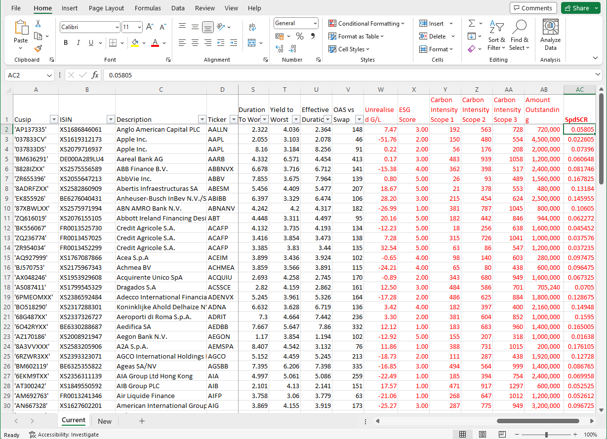 The same Bloomberg inputsheet can be used in the Portfolio SCR Form to calculate SCR values. In this example, we calculate the Solvency II Spread SCR for both the 'Current' and 'New' tabs. Ensure the import format is set to 'Bloomberg.' Then, navigate to the "SII" tab and tick the checkbox next to "Spread SCR."